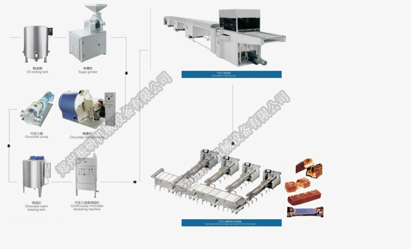 融油锅-糖粉机-精磨机-巧克力泵-保温缸-巧克力连续调温机-巧克力自动浇注机-巧克力理料扭结包装机